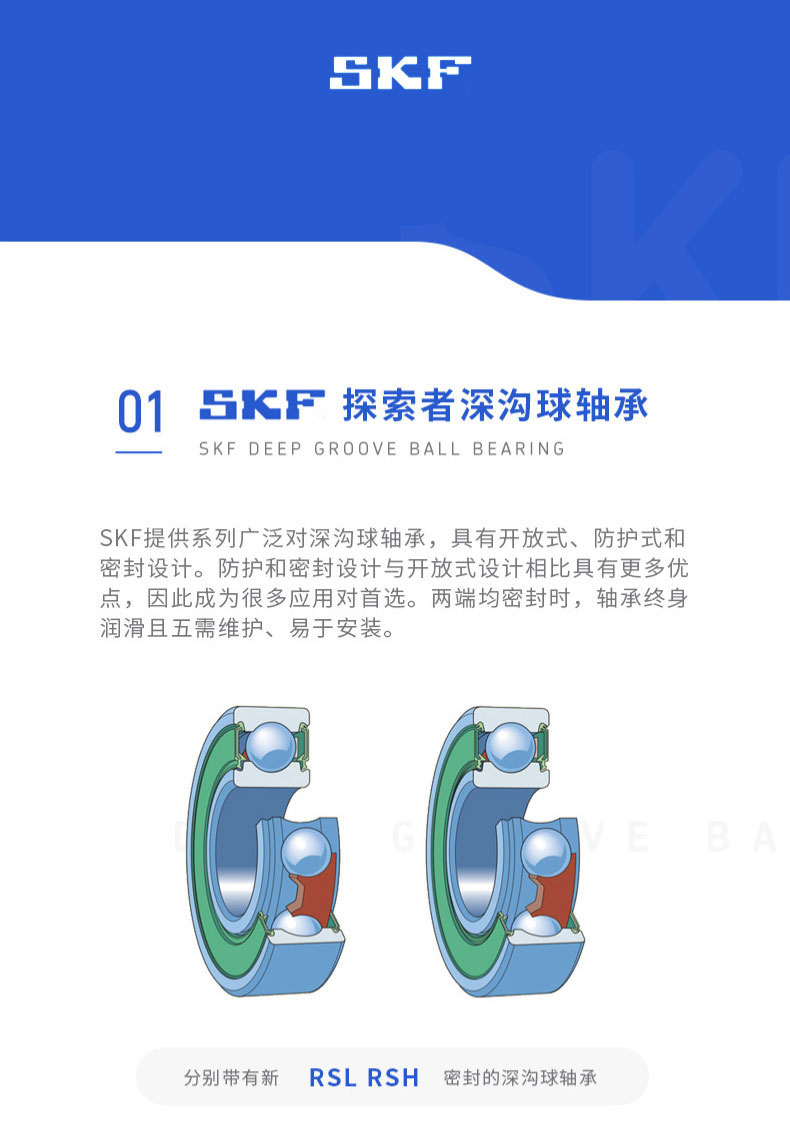 SKF深溝球軸承是一種儀器器件,有開式、雙面帶密封圈,帶密封的軸承在外圈上開有可裝密封圈或防塵蓋的溝槽,適用于高轉(zhuǎn)速甚至極高轉(zhuǎn)速的運行。